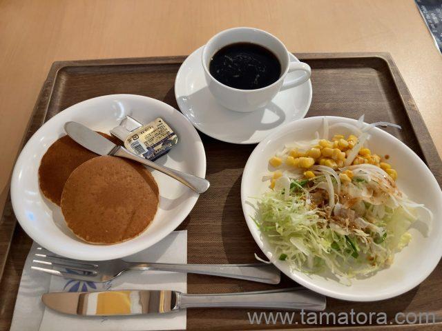 2回目はパン食で、パンケーキ、サラダ、コーヒー。