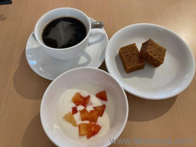 4回目は締めのデザートです。コーヒー、アガラサー(黒糖蒸しパン)、フルーツヨーグルト。