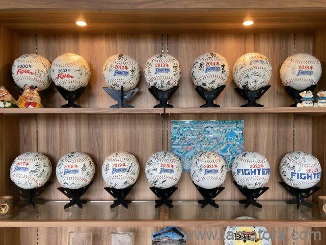 野球の日本ハムファイターズが、オフのキャンプで宿泊しているようです。選手のサインが寄せ書きされたボールが沢山飾られていました。