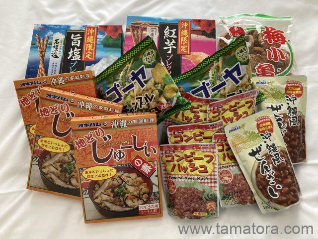 今回の沖縄旅行で東京まで持ち帰ったものです。写真を見ながら考えると、ほぼ自分用ですね。お土産というよりも、沖縄食品の買い出しになりました。でも、スーツケースにはまだ余裕がありました。じゅーしぃの素やコンビーフハッシュを3倍買っても良かったと後悔してます。