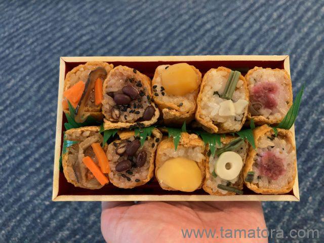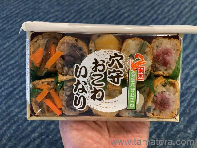 朝ごはんはこれです「穴守おこわいなり」。5種類の具材が入った稲荷寿司で、甘めの味付けです。2023年1月に沖縄県名護市に泊まって美ら海水族館に行った時、出発前の羽田空港で食べてとても美味しかったんです。その時はサウスピアの65番ゲートでした。ノースにあるのか心配でしたが、見つけられてラッキーです。