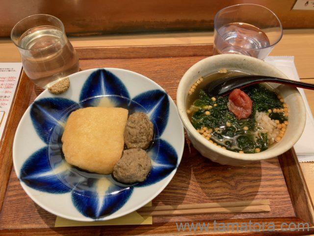 鰯つみれ、厚揚げ、梅干しとあおさの出汁茶漬け。