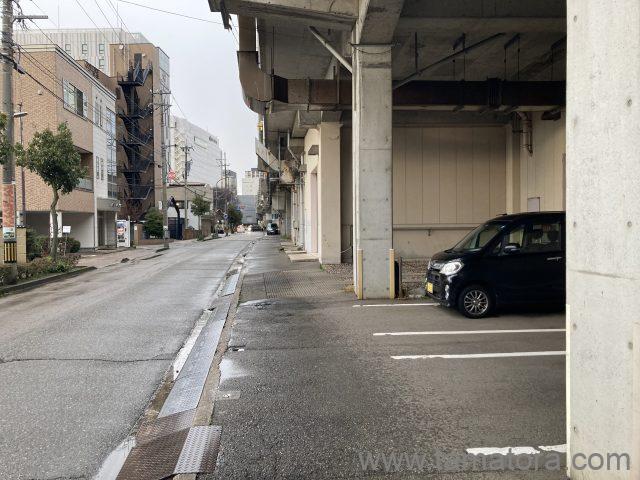 少し雨が降っていますが、金沢駅西口側から出ると、線路の高架が張り出している下を歩いて濡れずにホテルの目の前まで行けました。