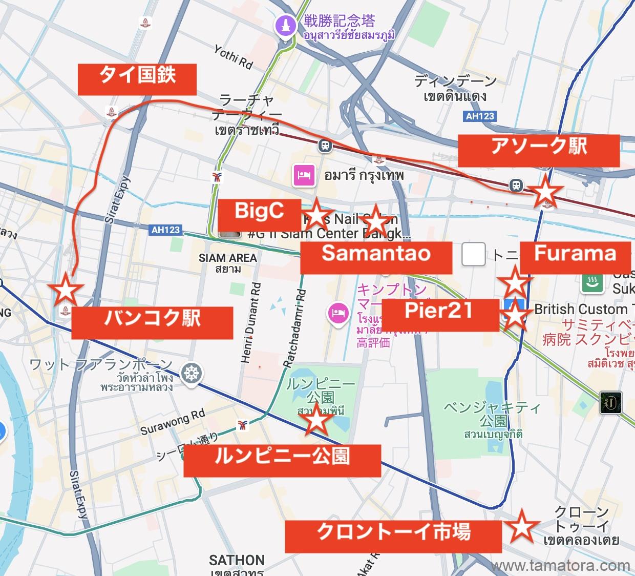 そして、今回の旅行で訪れた場所の位置関係が分かるように、バンコク中心部だけを拡大して追記しました。ガイドブックや観光情報だとお寺や水上マーケットが定番の観光スポットですが、2泊3日という短期のため移動距離を短かくして、BTSスクンビット線、MRTブルーラインで移動できる範囲に限定しています。