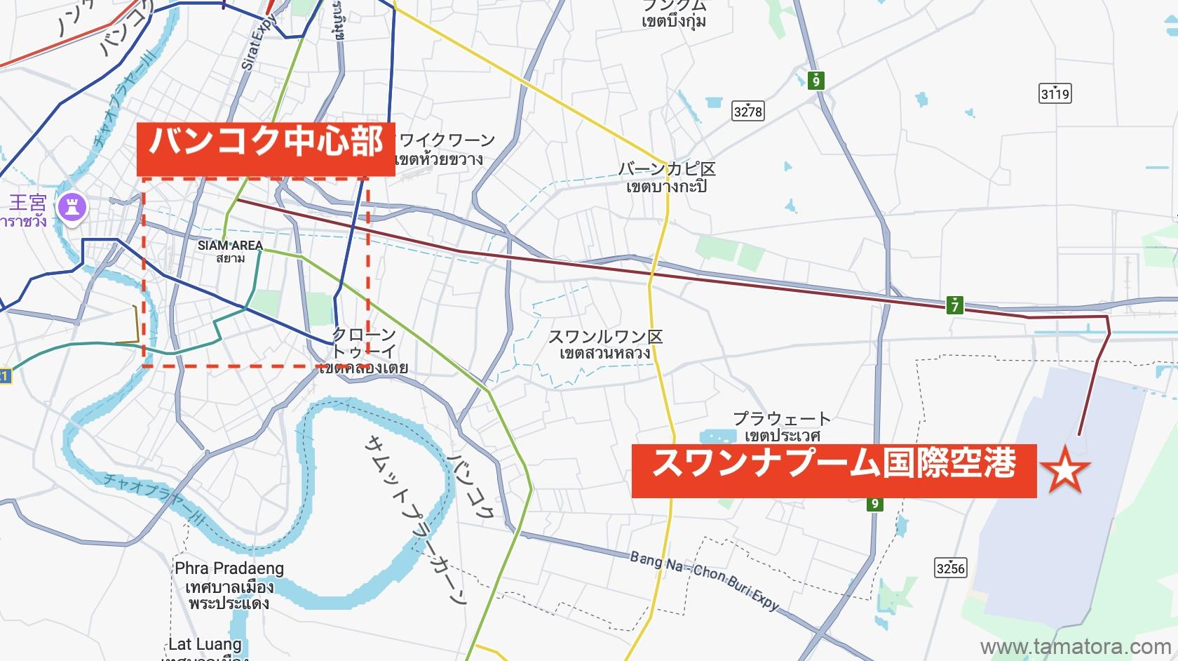 スワンナプーム国際空港とバンコク中心部の位置関係です。スワンナプーム国際空港はバンコク空港と呼んだりしてしまいますが、住所はバンコクではないんですよね。