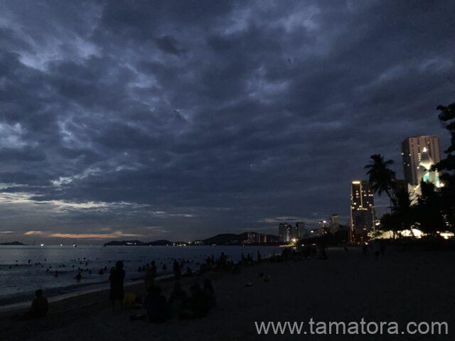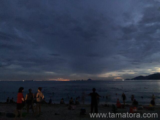 最終日も日の出前のニャチャンビーチを散歩してきます。砂浜を照らすライトが次々に消えて行き、逆にビーチは真っ暗になっていました。といっても、写真では見えにくいですが、散歩している人、泳いでいる人、写真撮影している人、チームでダンスしている人、多くの人々が様々にビーチを楽しんでいます。