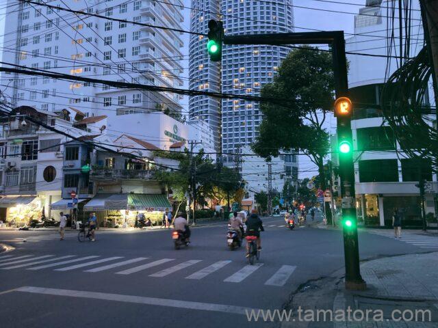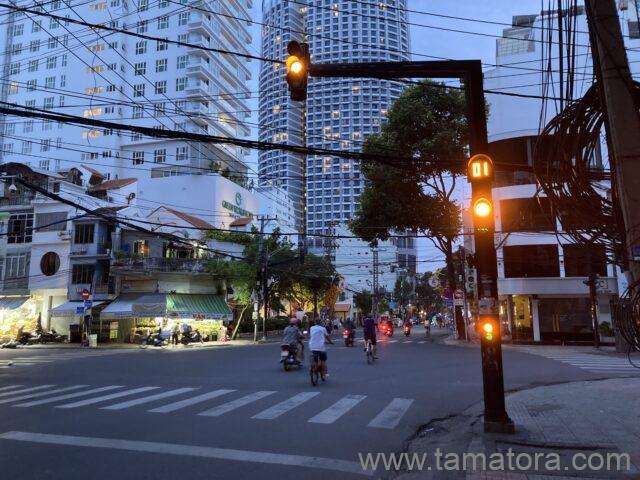 ニャチャンの街中で一番しっかりしていた交通信号です。青、黄、赤の色は日本と同じです。ただ、この信号は交差点の外側についているため、横断歩道の場所に立って待っていると全く見えません。車の流れが変わったことで信号も変わったのだと、そう判断していました。また、横断歩道の位置から見えないことで、信号があることに気づかず、信号と全く別のタイミングで渡る旅行者も大勢いました。