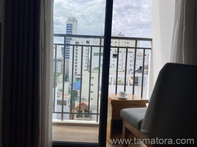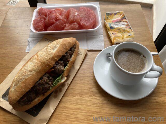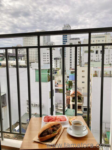 ホテルのベランダにテーブルを出し、椅子を持ってきて、景色を眺めながらの朝食です。まあ、見える景色は他の高層ホテルの背中だったり、下の道には犬に悪戯して怒られる子どもだったり。それでも、外の景色が見える広い空間で食べられるのは気分がいいです。ベトナムで一番おいしかったのは、このバインーとグレープフルーツでした。