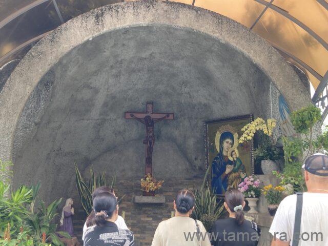 教会は小さな丘の上にあり、マリア像と礼拝堂がまるで森の中にあるように見えます。