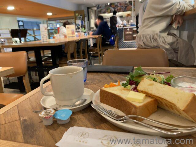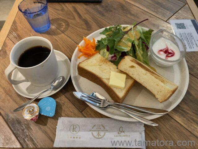 宙に浮いているような場所にあるため、最初は見つけられませんでした。思いの外、空いていてのでもしかしたら穴場なのかもしれません。そして、メゾンカイザーのトーストが美味しかったです。小麦だと思いますが、少し甘さを感じました。ジャムなどの塗るものが無いから寂しいと最初は思っていましたが、いやこれはパンを楽しむにはバターだけにするのが正解だと思います。ソーセージかベーコン、または卵が付いていると完璧です。ホットコーヒーはお代わり無料のようです。ただ、次もあるのでお代わりはもらいませんでした。