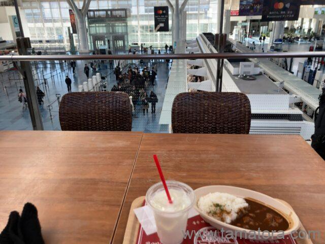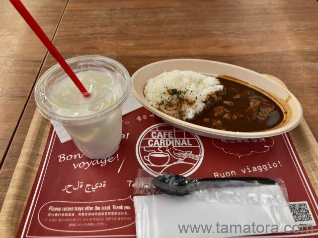 カレーは少しピリッとしたので、ヨーグルトを頼んでおいて良かった。量は多くはないですがお肉はしっかり入ってました。航空会社のカウンターに並ぶ方々を見ながら食べました。