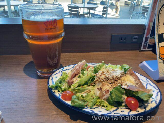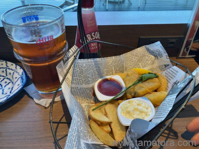 ハブエール(パイント 1,050円) + ひとくちフィッシュ&チップス(780円) + 生ハムシーザーサラダ(500円) = 2,330円