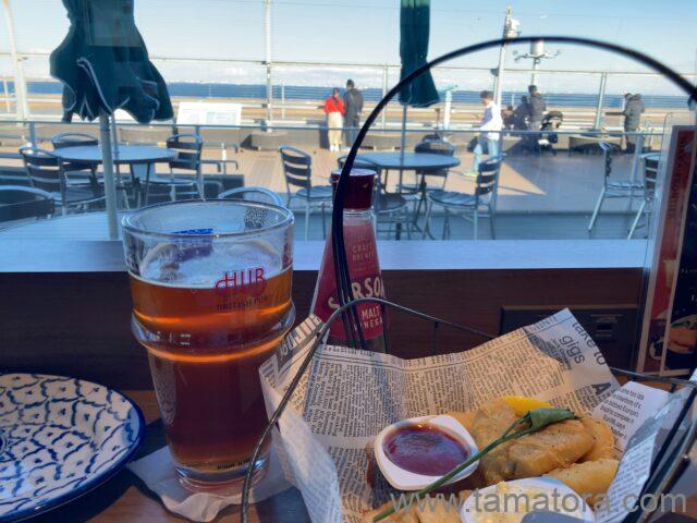 そういえば、飛行機を見ながら食べられる店は、今日は初めてです。シーザーサラダとフィッシュ&チップスは少なめで、満腹にはならない量です。ワインビネガーを揚げた鱈にドバドバと掛けて食べました。タルタルソースも付いてきますから、それと合わせるのも美味しかったです。ちょっと酢が強めかもしれませんが、フライドポテトの甘味もあるし、丁度良かったですね。