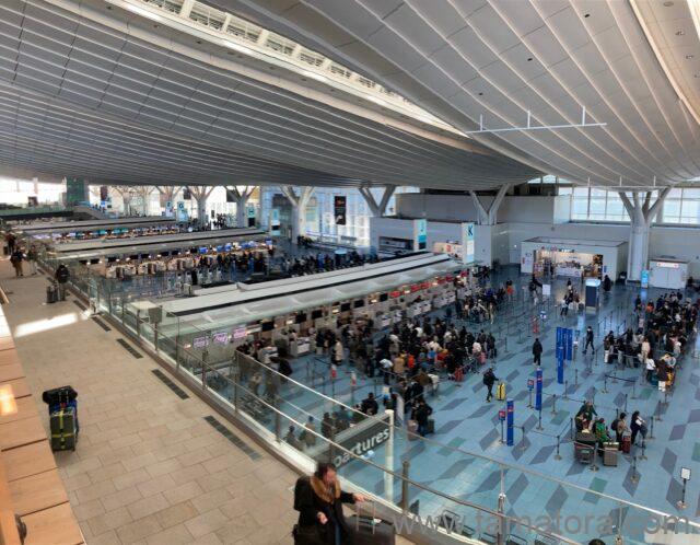国際線が発着するターミナルは、様々な航空会社のカウンターが並ぶ、そんな風景が特徴的です。