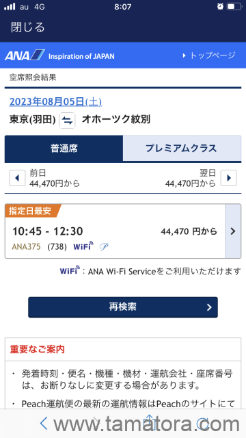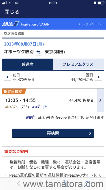 航空券を確保したのは、2週間前でした。その時の運賃は羽田発が44,470円、復路の紋別発が44,470円、なんと合計が88,940円です! これを18,000マイルで乗れたのですから「1マイル=5円弱」となって、とても有効にマイルが活用できました。