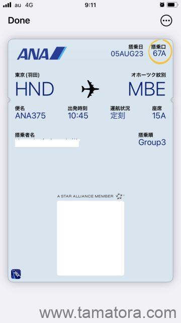 羽田空港 第二ターミナルでの搭乗口が、最初は505と案内され、直前に67Aに変更されました。ANAアプリの表示だと、変更された点がオレンジで囲われていて分かりやすいですね。