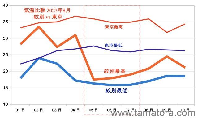 そんな夏休み真っ盛りのお盆前ですが、どこに行くか悩んで涼しさを求めた結果の「紋別」です。8月1〜10日で、東京と紋別の気温をグラフにしました。紋別滞在中は、「東京最低気温よりも紋別最高気温の方が低い」ことがわかります。それが通常のようで、8月1〜4日に紋別の気温がググっと30度を超えていますが、地元のタクシーの運転手によると初めての経験だそうです。通常の年だと、暑い日は最高気温は25〜27度ですが、そこまでになることはあまり無いとのこと。