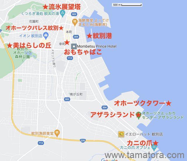 今回の訪問地は、この市街地マップに収まる範囲でした。ホテルから遠いカニの爪、オホーツクタワー、アザラシランドは、バスで行きました。
